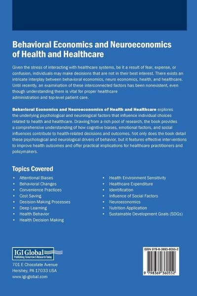 Given the stress of interacting with healthcare systems, be it a result of fear, expense, or confusion, individuals may make decisions that are not in their best interest. There exists an intricate interplay between behavioral economics, neuro economics, health, and healthcare. Until recently, an examination of these interconnected factors has been nonexistent, even though understanding them is vital for proper healthcare administration and top-level patient care. Behavioral Economics and Neuroeconomics of Health and Healthcare explores the underlying psychological and neurological factors that influence individual choices related to health and healthcare. Drawing from a rich pool of research, the book provides a comprehensive understanding of how cognitive biases, emotional factors, and social influences contribute to health-related decisions and outcomes. Not only does the book detail these psychological and neurological drivers of behavior, but it features effective interventions to improve health outcomes and offer practical implications for healthcare practitioners and policymakers.