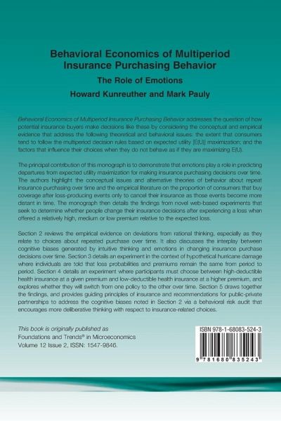 Behavioral Economics of Multiperiod Insurance Purchasing Behavior addresses the question of how potential insurance buyers make decisions like these by considering the conceptual and empirical evidence that address the following theoretical and behavioral issues: the extent that consumers tend to follow the multiperiod decision rules based on expected utility [E(U)] maximization; and the factors that influence their choices when they do not behave as if they are maximizing E(U). The principal contribution of this monograph is to demonstrate that emotions play a role in predicting departures from expected utility maximization for making insurance purchasing decisions over time. The authors highlight the conceptual issues and alternative theories of behavior about repeat insurance purchasing over time and the empirical literature on the proportion of consumers that buy coverage after loss-producing events only to cancel their insurance as those events become more distant in time. The monograph then details the findings from novel web-based experiments that seek to determine whether people change their insurance decisions after experiencing a loss when offered a relatively high, medium or low premium relative to the expected loss. Section 2 reviews the empirical evidence on deviations from rational thinking, especially as they relate to choices about repeated purchase over time. It also discusses the interplay between cognitive biases generated by intuitive thinking and emotions in changing insurance purchase decisions over time. Section 3 details an experiment in the context of hypothetical hurricane damage where individuals are told that loss probabilities and premiums remain the same from period to period. Section 4 details an experiment where participants must choose between high-deductible health insurance at a given premium and low-deductible health insurance at a higher premium, and explores whether they will switch from one policy to the other over time. Section 5 draws together the findings, and provides guiding principles of insurance and recommendations for public-private partnerships to address the cognitive biases noted in Section 2 via a behavioral risk audit that encourages more deliberative thinking with respect to insurance-related choices.