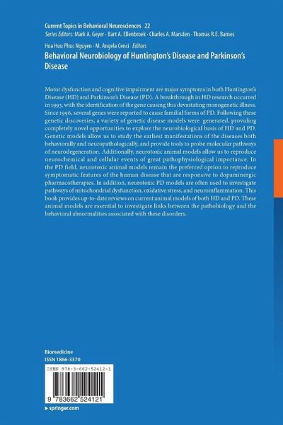 Motor dysfunction and cognitive impairment are major symptoms in both Huntington's Disease (HD) and Parkinson's Disease (PD). A breakthrough in HD research was the identification of the gene that causes this devastating monogenetic illness. Similarly, several genes were found to cause familial forms of PD. With their identification, a plethora of genetic animal models has been generated and has revolutionized the understanding of the pathobiology and pathophysiology of these disorders. The models allow us to study the earliest manifestations of the diseases behaviorally and neuropathologically and help us understand how they progress over time. Additionally, neurotoxic animal models are still of high interest to the PD field, as they are being used to study e.g. mitochondrial dysfunction in PD. This book focuses on animal models of both diseases and how they have helped and will continue to help understand the behavioral neurobiology in these disorders.