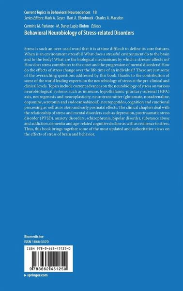Stress is such an over-used word that it is at time difficult to define its core features. When is an environment stressful? What does a stressful environment do to the brain and to the body? What are the biological mechanisms by which a stressor affects us? How does stress contributes to the onset and the progression of mental disorders? How do the effects of stress change over the life-time of an individual? These are just some of the overarching questions addressed by this book, thanks to the contribution of some of the world leading experts on the neurobiology of stress at the pre-clinical and clinical levels. Topics include current advances on the neurobiology of stress on various neurobiological systems such as immune, hypothalamic-pituitary-adrenal (HPA) axis, neurogenesis and neuroplasticity, neurotransmitter (glutamate, noradrenaline, dopamine, serotonin and endocannabinoid), neuropeptides, cognition and emotional processing as well as in utero and early postnatal effects. The clinical chapters deal with the relationship of stress and mental disorders such as depression, posttraumatic stress disorder (PTSD), anxiety disorders, schizophrenia, bipolar disorder, substance abuse and addiction, dementia and age-related cognitive decline as well as resilience to stress. Thus, this book brings together some of the most updated and authoritative views on the effects of stress of brain and behavior.