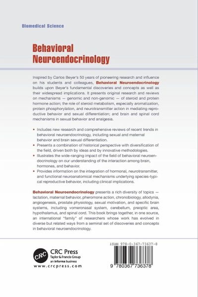 NEUROENDOCRINOLOGY OF SEXUAL BEHAVIOR. Pioneering Studies on the Effects of Steroid Hormone Metabolism on the Brain and Behavior. Neuroendocrine and Behavioral Role of the Medial Preoptic Area in Rabbits: Recollections of Collaboration with Carlos Beyer. Hormonal Regulation of the Copulatory Motor Pattern in Mammals. Neuronal and Neurochemical Correlates of Copulatory Motor Patterns in Male Rats. Male Sexual Satiety and the Coolidge Effect in Rats: Relation between Behavioral and Seminal Parameters. The Sexual Cerebellum. Intracellular Signaling Involved in Progestin Regulation of Female Sexual Behavior in Rodents. The Delicate Line between "Wanting" (Desire) and "Liking" (Reward) Sexual Behavior. NEUROENDOCRINOLOGY OF MATERNAL BEHAVIOR...AND BRAIN DEVELOPMENT. The Rabbit Doe as a Model of Neuroendocrine Synchronization. The Domestic Rabbit (Oryctolagus Cuniculus) as a Model Animal: From Reproductive Neurobiology to Developmental Psychobiology. A View of Rabbit Maternal Behavior from the Perspectives of Complex Systems and Chronostasis. Multisignaling Approach to the Study of Sexual Differentiation of Brain and Behavior in Mammals. Ubiquitous Modulators of Brain Activity: GABA and Carlos Beyer-Flores, PhD. NEUROENDOCRINE INSIGHTS TOWARD DEVELOPMENT OF THERAPEUTIC AGENTS. From Reproductive Neuroendocrinology and Lactation to Vasoinhibins and Angiogenesis. Neuroendocrine and Molecular Aspects of the Physiology and Pathology of the Prostate. From Sexual Behavior to Analgesia to an Antinociceptive Agent: Glycinamide. EPILOGUE. How Carlos Beyer Influenced our Lives. Photo Gallery.