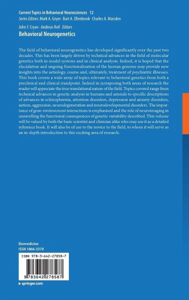 This book covers a wide array of topics relevant to behavioral genetics from both a preclinical and clinical standpoint. Indeed in juxtaposing both areas of research the reader will appreciate the true translational nature of the field. Topics covered range from technical advances in genetic analysis in humans and animals to specific descriptions of advances in schizophrenia, attention disorders, depression and anxiety disorders, autism, aggression, neurodegeneration and neurodevelopmental disorders. The importance of gene-environment interactions is emphasised and the role of neuroimaging in unravelling the functional consequences of genetic variability described. This volume will be valued by both the basic scientist and clinician alike who may use it as a detailed reference book. It will also be of use to the novice to the field, to whom it will serve as an in-depth introduction to this exciting area of research.