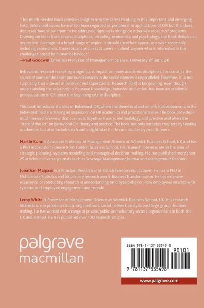 This book introduces the idea of Behavioral OR, where the theoretical and empirical developments in the behavioral field are making an impression on OR academics and practitioners alike. The book provides a much needed overview that connects together theory, methodology and practice and offers the "state of the art" on Behavioral Operational Research theory and practice. The book not only includes chapters by leading academics, but also includes rich and insightful real-life case studies by practitioners.