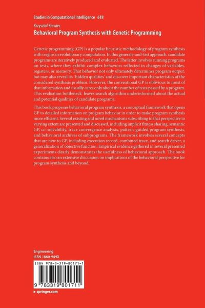 This book proposes behavioral program synthesis, a conceptual framework that opens GP to detailed information on program behavior in order to make program synthesis more efficient.Several existing and novel mechanisms subscribing to that perspective to varying extent are presented and discussed, including implicit fitness sharing, semantic GP, co-solvability, trace convergence analysis, pattern-guided program synthesis, and behavioral archives of subprograms. The framework involves several concepts that are new to GP, including execution record, combined trace, and search driver, a generalization of objective function. Empirical evidence gathered in several presented experiments clearly demonstrates the usefulness of behavioral approach. The book contains also an extensive discussion of implications of the behavioral perspective for program synthesis and beyond.