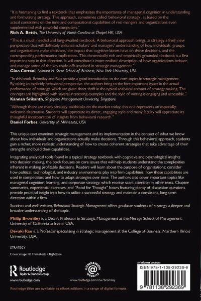 This unique text examines strategic management and its implementation in the context of what we know about how individuals and organizations actually make decisions. Through this behavioral approach, students gain a richer, more realistic understanding of how to create coherent strategies that take advantage their strengths and build their capabilities. Integrating analytical tools found in a typical strategy textbook with cognitive and psychological insights into decision making, the book focuses on core issues that will help students understand the complexities inherent in making profitable decisions. Readers will learn about the purpose of organizations; consider how political, technological, and industry environments play into firm capabilities; how these capabilities are used in competition; and how to adapt strategies over time. The authors also cover important topics like managerial cognition, learning, and corporate strategy, which receive scant attention in other texts. Chapter summaries, experiential exercises, and "Food for Thought" boxes featuring plenty of discussion questions provide practical insight into how to utilize a successful strategy and maintain a consistent, long-term direction within a firm. Succinct and well-written, Behavioral Strategic Management offers graduate students of strategy a deeper and broader understanding of the topic.