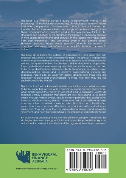 This book is a financial adviser’s guide to behavioural finance – the psychology of financial decision-making. Psychological research shows that often people don’t conform with ‘rational’ financial models and theories. Rather, they are subject to a range of decision-making biases. These biases are often deeply rooted in the way people think, in the structures and functions of their brains, in their shared evolutionary histories, in their social environments and cultures, in the lessons they have learnt from past experiences, and sometimes even in their genetic codes. However, because many biases operate beneath the surface of conscious awareness, their influence on people’s decisions can remain hidden. This book dives below the surface of consciousness and asks: how can financial advisers use what we find down there? The answer is that advisers can use insights from behavioural finance to improve face-to-face conversations, risk questionnaires, fact-finders, advice documents, application forms, websites and investment reports. Behavioural finance can be used to better understand and influence clients, to manage an adviser’s own decision-making biases, and to improve organisational cultures and practices. And it can be used with clients ranging from those who are financially illiterate and overwhelmed, to those who think they are too sophisticated to be biased. The first half of the book shows how behavioural finance can help advisers to better align their advice with a client’s risk profile, to assist clients to set goals and to spend their money in ways that lead to happiness, to provide financial literacy education that clients are likely to respond to, to coach clients through market cycles, and to invest in portfolios that exploit other investors’ decision-making biases. The second half discussed how advisers can help clients to avoid common asset allocation and diversification errors, how they can more effectively communicate with and influence clients, how they can assist them to buy residential property and to save for retirement, and how they can mitigate the impacts of conflicts of interest. By discovering and influencing the real drivers of people’s decisions, the strategies discussed throughout this book have the potential to improve outcomes for advisers, their clients and the organisations advisers represent.