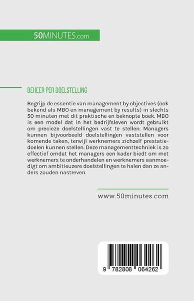 Begrijp de essentie van management by objectives (ook bekend als MBO en management by results) in slechts 50 minuten met dit praktische en beknopte boek. MBO is een model dat in het bedrijfsleven wordt gebruikt om precieze doelstellingen vast te stellen. Managers kunnen bijvoorbeeld doelstellingen vaststellen voor komende taken, terwijl werknemers zichzelf prestatiedoelen kunnen stellen. Deze managementtechniek is zo effectief omdat het managers een kader biedt om met werknemers te onderhandelen en werknemers aanmoedigt om ambitieuzere doelstellingen te halen dan ze anders zouden nastreven. Dit boek geeft u een handige inleiding tot management by objectives en stelt u in staat collectieve doelstellingen om te zetten in specifieke doelen door middel van vier belangrijke ingrediënten: validatie, besluitvorming, tijdschema's en feedback. U leert niet alleen de helderheid van uw bedrijf te vergroten met gerichte doelstellingen, maar u zult ook casestudies uit de praktijk bekijken, de tekortkomingen van het instrument ontdekken, waaronder het onvermogen om de evolutie van werkomgevingen te voorspellen, en kennismaken met verwante modellen, zoals SMART-doelstellingen. Over management by objectives : Het concept van MOB verscheen voor het eerst in de jaren 1950 in de VS als antwoord op de economische groei. Het is een proces waarbij de werknemers van een bedrijf doelstellingen bepalen en zichzelf passende termijnen opleggen om die te bereiken. Het kan door iedereen met een managementfunctie worden toegepast om de productiviteit binnen de organisatie te verbeteren. In dit boek ontdekt u hoe management by objectives de productiviteit in een bedrijf kan verbeteren, leert u de beste versie van de methode toe te passen in uw eigen bedrijf, en gebruikt u de resultaten om uw hele organisatie een gevoel van duidelijkheid te geven. Een duidelijke uitleg van de voordelen en mogelijke nadelen van de methode, een bespreking van een praktische casus en een inleiding tot verwante modellen geven u de instrumenten die u nodig hebt om uw aanpak op uw situatie af te stemmen.
