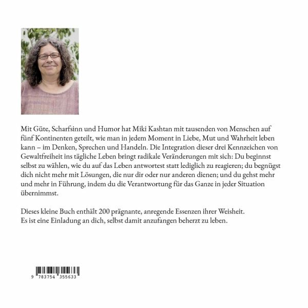 Mit Güte, Scharfsinn und Humor hat Miki Kashtan mit tausenden von Menschen auf fünf Kontinenten geteilt, wie man in jedem Moment in Liebe, Mut und Wahrheit leben kann - im Denken, Sprechen und Handeln. Die Integration dieser drei Kennzeichen von Gewaltfreiheit ins tägliche Leben bringt radikale Veränderungen mit sich: Du beginnst selbst zu wählen, wie du auf das Leben antwortest statt lediglich zu reagieren; Du begnügst dich nicht mehr mit Lösungen, die nur dir oder nur anderen dienen; und du gehst mehr und mehr in Führung, indem du die Verantwortung für das Ganze in jeder Situation übernimmst.Dieses kleine Buch enthält 200 prägnante, anregende Essenzen ihrer Weisheit. Es ist eine Einladung an Dich, selbst damit anzufangen beherzt zu leben.Miki Kashtan ist eine bodenständige Visionärin, die sich einsetzt für eine Welt für alle. Sie ist Gründerin der NGL, einer Gemeinschaft für gewaltfreie globale Befreiung, deren Ziel darin besteht, die Gewaltfreiheit durch fortlaufende Live-Wahrheits-Experimente, die sich auf individuelle und kollektive Befreiung konzentrieren, in das Gefüge des menschlichen Lebens zu integrieren. Ihre letzte englische Buchveröffentlichung ist "The Highest Common Denominator" (Der höchste gemeinsame Nenner); sie schreibt regelmäßig auf ihrem Blog "The Fearless Heart" zu theoretischen, praktischen, politischen und spirituellen Fragen in Bezug auf das Patriarchat, Kapitalismus, Gewaltfreiheit und die Schenkökonomie. Ihre Artikel sind u.a. veröffentlicht in der New York Times, in Tikkun, Waging Nonviolence, Shareable, Peace and Conflict und Self and Society. Sie hat einen Doktortitel in Soziologie der University of California, Berkeley (USA).Ins Deutsche übersetzt wurde das Buch vom Trio Helene Weynerowski, Sitana Omer und Thomas Stelling:"Wir haben erlebt, wie froh es uns macht, gemeinsam etwas entstehen zu lassen.""Der individuelle Beitrag ist zurückgetreten hinter das Ziel, etwas Gemeinsames zu schaffen.""So beglückend, die Kreativität gemeinsamer Sprachschöpfung immer wieder zu erleben."