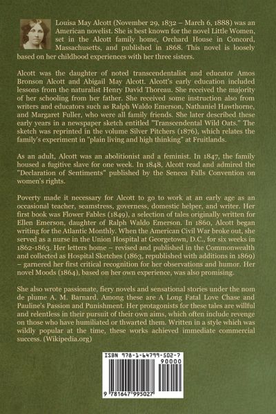 Louisa May Alcott (November 29, 1832 - March 6, 1888) was an American novelist. She is best known for the novel Little Women, set in the Alcott family home, Orchard House in Concord, Massachusetts, and published in 1868. This novel is loosely based on her childhood experiences with her three sisters. Alcott was the daughter of noted transcendentalist and educator Amos Bronson Alcott and Abigail May Alcott. Alcott's early education included lessons from the naturalist Henry David Thoreau. She received the majority of her schooling from her father. She received some instruction also from writers and educators such as Ralph Waldo Emerson, Nathaniel Hawthorne, and Margaret Fuller, who were all family friends. She later described these early years in a newspaper sketch entitled "Transcendental Wild Oats." The sketch was reprinted in the volume Silver Pitchers (1876), which relates the family's experiment in "plain living and high thinking" at Fruitlands. As an adult, Alcott was an abolitionist and a feminist. In 1847, the family housed a fugitive slave for one week. In 1848, Alcott read and admired the "Declaration of Sentiments" published by the Seneca Falls Convention on women's rights. Poverty made it necessary for Alcott to go to work at an early age as an occasional teacher, seamstress, governess, domestic helper, and writer. Her first book was Flower Fables (1849), a selection of tales originally written for Ellen Emerson, daughter of Ralph Waldo Emerson. In 1860, Alcott began writing for the Atlantic Monthly. When the American Civil War broke out, she served as a nurse in the Union Hospital at Georgetown, D.C., for six weeks in 1862-1863. Her letters home - revised and published in the Commonwealth and collected as Hospital Sketches (1863, republished with additions in 1869) - garnered her first critical recognition for her observations and humor. Her novel Moods (1864), based on her own experience, was also promising. She also wrote passionate, fiery novels and sensational stories under the nom de plume A. M. Barnard. Among these are A Long Fatal Love Chase and Pauline's Passion and Punishment. Her protagonists for these tales are willful and relentless in their pursuit of their own aims, which often include revenge on those who have humiliated or thwarted them. Written in a style which was wildly popular at the time, these works achieved immediate commercial success. (Wikipedia.org)