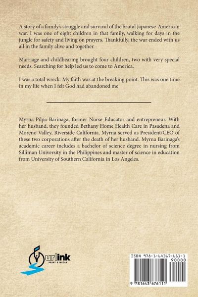 A story of a family's struggle and survival of the brutal Japanese-American war. I was one of eight children in that family, walking for days in the jungle for safety and living on prayers. Thankfully, the war ended with us all in the family alive and together. Marriage and childbearing brought four children, two with very special needs. Searching for help led us to come to America. I was a total wreck. My faith was at the breaking point. This was one time in my life when I felt God had abandoned me.