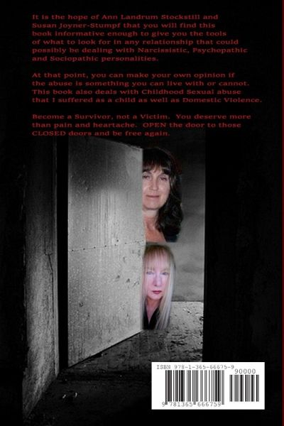 BEHIND CLOSED DOORS will actually open doors for you. It is the hope of Ann Landrum Stockstill and Susan Joyner-Stumpf that you will find this book informative enough to give you the tools of what to look for in any relationship that could possibly be dealing with Narcissistic, Psychopathic and Sociopathic personalities. At that point, you can make your own decision if the abuse is something you can live with or not. This book also deals with Childhood Sexual Abuse that I suffered as a child as well as Domestic Violence, other forms of abuse, and Bullying. Become a Survivor, not a Victim. You deserve more than pain, heartache, fear and sorrow. OPEN the door to those CLOSED doors and be free again.
