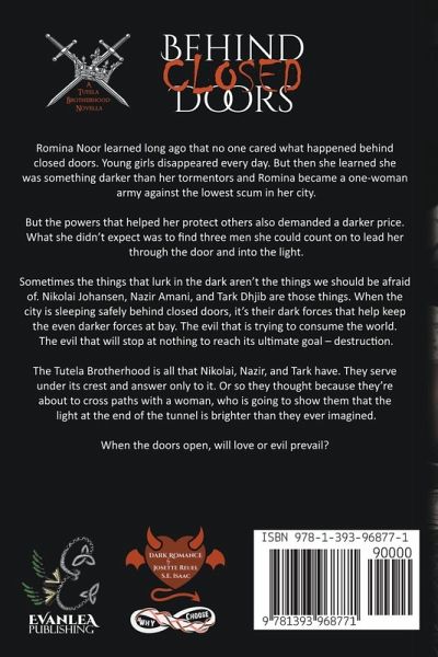 **Dark Paranormal Reverse Harem Romance** Looking for something edgy, dark, and romantic? S.E. Isaac & Josette Reuel bring you the Tutela Brotherhood where dark worlds collide and three warriors find their mate. _____ Romina Noor learned long ago that no one cared what happened behind closed doors. Young girls disappeared every day. But then she learned she was something darker than her tormentors and Romina became a one-woman army against the lowest scum in her city. But the powers that helped her protect others also demanded a darker price. What she didn't expect was to find three men she could count on to lead her through the door and into the light. Sometimes the things that lurk in the dark aren't the things we should be afraid of. Nikolai Johansen, Nazir Amani, and Tark Dhjib are those things. When the city is sleeping safely behind closed doors, it's their dark forces that help keep the even darker forces at bay. The evil that is trying to consume the world. The evil that will stop at nothing to reach its ultimate goal-- destruction. The Tutela Brotherhood is all that Nikolai, Nazir, and Tark have. They serve under its crest and answer only to it. Or so they thought because they're about to cross paths with a woman, who is going to show them that the light at the end of the tunnel is brighter than they ever imagined. When the doors open, will love or evil prevail?