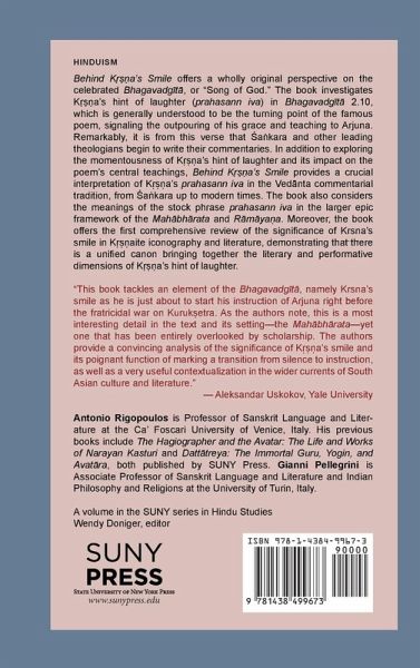 Examines K¿¿¿a's hint of laughter (prahasann iva) in the Bhagavadg¿t¿, its interpretations in the Ved¿nta commentarial tradition, and its significance in K¿¿¿aite iconography and literature. Behind K¿¿¿a's Smile offers a wholly original perspective on the celebrated Bhagavadg¿t¿, or "Song of God." The book investigates K¿¿¿a's hint of laughter (prahasann iva) in Bhagavadg¿t¿ 2.10, which is generally understood to be the turning point of the famous poem, signaling the outpouring of his grace and teaching to Arjuna. Remarkably, it is from this verse that ¿äkara and other leading theologians begin to write their commentaries. In addition to exploring the momentousness of K¿¿¿a's hint of laughter and its impact on the poem's central teachings, Behind K¿¿¿a's Smile provides a crucial interpretation of K¿¿¿a's prahasann iva in the Ved¿nta commentarial tradition, from ¿äkara up to modern times. The book also considers the meanings of the stock phrase prahasann iva in the larger epic framework of the Mah¿bh¿rata and R¿m¿yäa. Moreover, the book offers the first comprehensive review of the significance of K¿¿¿a's smile in K¿¿¿aite iconography and literature, demonstrating that there is a unified canon bringing together the literary and performative dimensions of K¿¿¿a's hint of laughter.