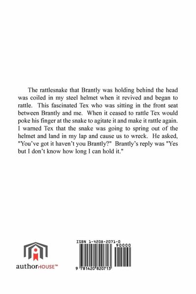 The rattlesnake that Brantly was holding behind the herd was coiled in my steel helmet when it revived and began to rattle. This fascinated Tex who was sitting in the front seat between Brantly and me. When it ceased to rattle Tex would poke his finger at the snake to agitate it and make it rattle again. I warned Tex that the snake was going to spring out of the helmet and land in my lap and cause us to wreck. He asked, "You've got it haven't you Brantly?" Brantly's reply was "Yes but I don't know how long I can hold it."