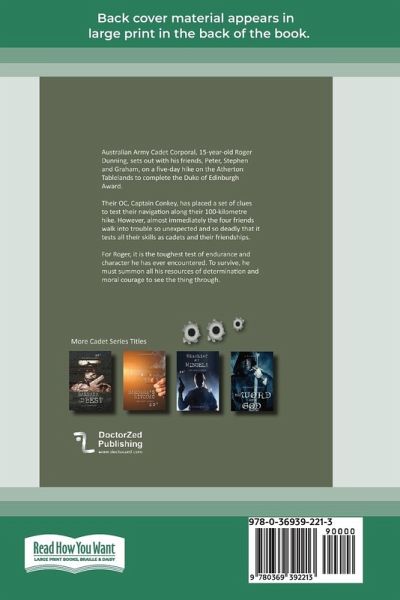 Australian Army Cadet Corporal, 15-year-old Roger Dunning, sets out with his friends, Peter, Stephen and Graham, on a five-day hike on the Atherton Tablelands to complete the Duke of Edinburgh Award. Their OC, Captain Conkey, has placed a set of clues to test their navigation along their 100-kilometre hike. However, almost immediately the four friends walk into trouble so unexpected and so deadly that it tests all their skills as cadets and their friendships. For Roger, it is the toughest test of endurance and character he has ever encountered. To survive, he must summon all his resources of determination and moral courage to see the thing through.