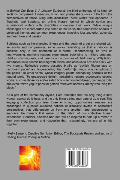 In Behind Our Eyes 3: A Literary Sunburst, the third anthology of its kind, six sections comprised of memoirs, fiction, and poetry share slices of life from the perspectives of those living with disabilities. Most works first appeared in Magnets and Ladders, an online literary journal in which novice and experienced writers with disabilities showcase their work. While unique challenges are incorporated into some of the works, this compilation speaks to universal themes and common experiences, involving loss and grief, adversity and fear, love and passion. Subjects such as life-changing illness and the death of a pet are shared with sensitivity and compassion; some works reminding us that a rainbow is possible only in the aftermath of a storm. Heartbreaking, as well as heartwarming, memoirs recount experiences belonging to military veterans, children of immigrants, and parents in the trenches of child rearing. Witty fiction introduces us to cosmic bowling with aliens, and asks us to envision a sky with two moons. Reflective poems describe braille as "ticklish filigree lace on cardboard paper" and fingerspelling that "perform[s] magic in a cacophony of the palms." In other verse, lyrical imagery paints enchanting portraits of the natural world. To unexpected delight, tantalizing recipes accompany several works; such as those for edible salad bowls, lemon herb bread, cinnamon rolls, and even frozen yogurt pops for golden retrievers named Sammy who "sing the blues." As a part of the community myself, I am reminded that the only thing a deaf woman cannot do is hear, and the only thing a blind man cannot do is see. This engaging collection promises three enriching opportunities: readers are challenged to question outdated notions of disability; invited to appreciate perspectives that differentiate us from one another; and encouraged to embrace the threads that make up the fabric of our collective human experience. Readers, disabled and not, will be inspired to hold up a mirror to their own experiences, and recognize that, reassuringly, we are all in this together. --Kelly Sargent, Creative Nonfiction Editor, The Bookends Review and author of Seeing Voices: Poetry in Motion