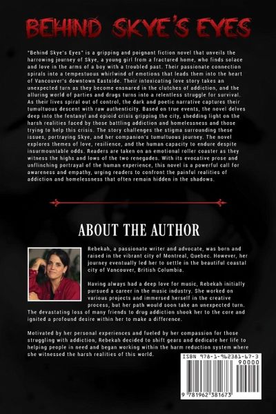 "Behind Skye's Eyes" is a gripping and poignant fiction novel that unveils the harrowing journey of Skye, a young girl from a fractured home who finds solace and love in the arms of a boy with a troubled past. Their passionate connection spirals into a whirlwind of emotions that leads them into the heart of Vancouver's Downtown Eastside. Their intoxicating love story takes an unexpected turn as they become trapped in the clutches of addiction, and the alluring world of parties and drugs turns into a relentless struggle for survival. As theirlives spiral out of control, the dark and poetic narrative captures their tumultuous descent with rawauthenticity. A fictional storyline inspired by true events, the novel delves deep into the fentanyl and opioid crisis gripping the city, shedding light on the harsh realities faced by those battling addiction and homelessness and those trying to help this crisis. The story challenges the stigma surrounding these issues, portraying Skye and her dark journey. The novel explores themes of love, resilience, and the human capacity to endure despite insurmountable odds. Readers are taken on an emotional roller coaster with its evocative prose and unflinching portrayal of the human experience, leaving them deeply moved and contemplating the profound complexities of life long after the final page.