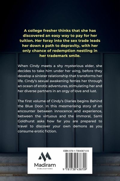 A college fresher thinks that she has discovered an easy way to pay for her tuition. Her foray into the sex trade leads her down a path to depravity, with her only chance of redemption nestling in her trademark smile. When Cindy meets a shy mysterious elder, she decides to take him under her wing, before they develop a sinister relationship that transforms her life. Cindy's sexual awakening ferries her through an ocean of erotic adventures, stimulating her and her diverse partners in an orgy of love and lust. The first volume of Cindy's Diaries begins Behind the Blue Door. In this mesmerising story of an encounter between innocence and experience, between the virtuous and the immoral, Sami Goldhurst asks how far you are prepared to travel to discover your own demons as you consume erotic fiction.