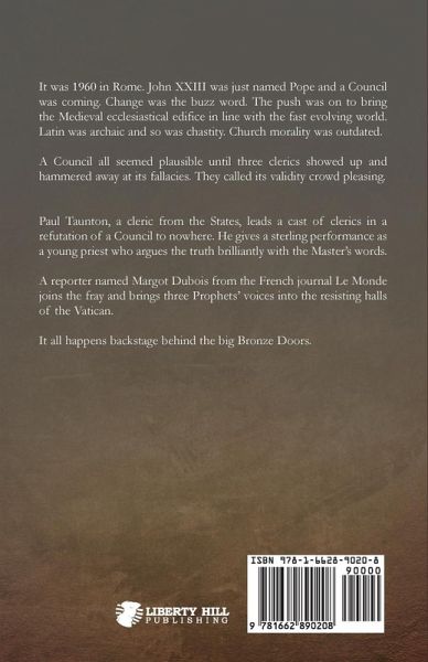 It was 1960 in Rome. John XXIII was just named Pope and a Council was coming. Change was the buzz word. The push was on to bring the Medieval ecclesiastical edifice in line with the fast evolving world. Latin was archaic and so was chastity. Church morality was outdated. A Council all seemed plausible until three clerics showed up and hammered away at its fallacies. They called its validity crowd pleasing. Paul Taunton, a cleric from the States, leads a cast of clerics in a refutation of a Council to nowhere. He gives a sterling performance as a young priest who argues the truth brilliantly with the Master's words. A reporter named Margot Dubois from the French journal Le Monde joins the fray and brings three Prophets' voices into the resisting halls of the Vatican. It all happens backstage behind the big Bronze Doors.