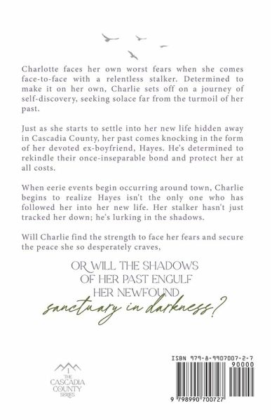 Charlotte faces her own worst fears when she comes face-to-face with a relentless stalker. Determined to make it on her own, Charlie sets off on a journey of self-discovery, seeking solace far from the turmoil of her past. Just as she starts to settle into her new life hidden away in Cascadia County, her past comes knocking in the form of her devoted ex-boyfriend, Hayes. He's determined to rekindle their once-inseparable bond and protect her at all costs. When eerie events begin occurring around town, Charlie begins to realize Hayes isn't the only one who has followed her into her new life. Her stalker hasn't just tracked her down; he's lurking in the shadows. Will Charlie find the strength to face her fears and secure the peace she so desperately craves, or will the shadows of her past engulf her newfound sanctuary in darkness?