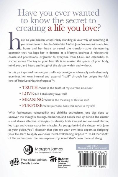 In Behind the Clutter, lifestyle coach, business consultant, and professional organizer June Saruwatari takes readers on an intimate journey through her own "stuff" to reveal the secrets of how she tackled her own clutter to achieve her success as an entrepreneur and consultant to top CEOs and celebrities. This is not your typical "how-to" book from an "expert"- instead, June confides in the reader as a "best friend," vulnerably sharing the internal thoughts, belief systems, and attitudes that are the true cause of her external clutter. Through her personal stories and simple exercises, June applies her unique metric of "truth, love, meaning, and purpose" to all the stuff of her life, modeling for readers how to connect the dots between their internal and external clutter; master the spaces of their body, mind, spirit, and heart; reveal the masterpiece of their own identity behind the clutter; and create a life they love.