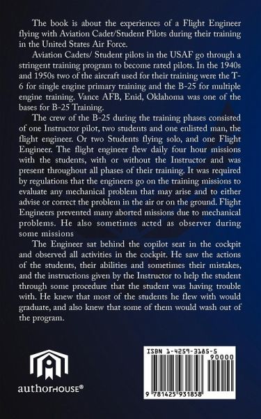 The book is about the experiences of a Flight Engineer flying with Aviation Cadet/Student Pilots during their training in the United States Air Force. Aviation Cadets/ Student pilots in the USAF go through a stringent training program to become rated pilots. In the 1940s and 1950s two of the aircraft used for their training were the T-6 for single engine primary training and the B-25 for multiple engine training. Vance AFB, Enid, Oklahoma was one of the bases for B-25 Training. The crew of the B-25 during the training phases consisted of one Instructor pilot, two students and one enlisted man, the flight engineer. Or two Students flying solo, and one Flight Engineer. The flight engineer flew daily four hour missions with the students, with or without the Instructor and was present throughout all phases of their training. It was required by regulations that the engineers go on the training missions to evaluate any mechanical problem that may arise and to either advise or correct the problem in the air or on the ground. Flight Engineers prevented many aborted missions due to mechanical problems. He also sometimes acted as observer during some missions The Engineer sat behind the copilot seat in the cockpit and observed all activities in the cockpit. He saw the actions of the students, their abilities and sometimes their mistakes, and the instructions given by the Instructor to help the student through some procedure that the student was having trouble with. He knew that most of the students he flew with would graduate, and also knew that some of them would wash out of the program.