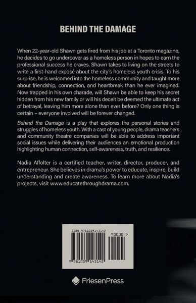 When 22-year-old Shawn gets fired from his job at a Toronto magazine, he decides to go undercover as a homeless person in hopes to earn the professional success he craves. Shawn takes to living on the streets to write a first-hand exposé about the city's homeless youth crisis. To his surprise, he is welcomed into the homeless community and taught more about friendship, connection, and heartbreak than he ever imagined. Now trapped in his own charade, will Shawn be able to keep his secret hidden from his new family or will his deceit be deemed the ultimate act of betrayal, leaving him more alone than ever before? Only one thing is certain - everyone involved will be forever changed. Behind the Damage is a play that explores the personal stories and struggles of homeless youth. With a cast of young people, drama teachers and community theatre companies will be able to address important social issues while delivering their audiences an emotional production highlighting human connection, self awareness, truth, and resilience.