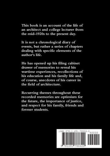 This book is an account of the life of an architect and college lecturer from the mid-1920s to the present day. It is not a chronological diary of events, but rather a series of chapters dealing with specific elements of the author's life. He has opened up his filing cabinet drawer of memories to reveal his wartime experiences, recollections of his education and his family life and, of course, anecdotes of his career in the field of architecture. Recurring themes throughout these recorded memories are optimism for the future, the importance of justice, and respect for his family, friends and former students.