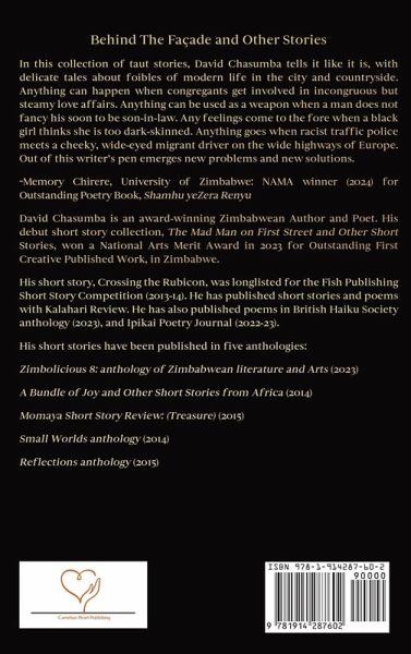 In this collection of taut stories, David Chasumba tells it like it is, with delicate tales about foibles of modern life in the city and countryside. Anything can happen when congregants get involved in incongruous but steamy love affairs. Anything can be used as a weapon when a man does not fancy his soon to be son-in-law. Any feelings come to the fore when a black girl thinks she is too dark-skinned. Anything goes when racist traffic police meets a cheeky, wide-eyed migrant driver on the wide highways of Europe. Out of this writer's pen emerges new problems and new solutions. Memory Chirere, University of Zimbabwe: NAMA winner (2024) for Outstanding Poetry Book, Shamhu yeZera Renyu David Chasumba is an award-winning Zimbabwean Author and Poet. His debut short story collection, The Mad Man on First Street and Other Short Stories, won a National Arts Merit Award in 2023 for Outstanding First Creative Published Work, in Zimbabwe. His short story, Crossing the Rubicon, was longlisted for the Fish Publishing Short Story Competition (2013-14). He has published short stories and poems with Kalahari Review. He has also published poems in British Haiku Society anthology (2023), and Ipikai Poetry Journal (2022-23). His short stories have been published in five anthologies: Zimbolicious 8: anthology of Zimbabwean literature and Arts (2023) A Bundle of Joy and Other Short Stories from Africa (2014) Momaya Short Story Review: (Treasure) (2015) Small Worlds anthology (2014) Reflections anthology (2015)