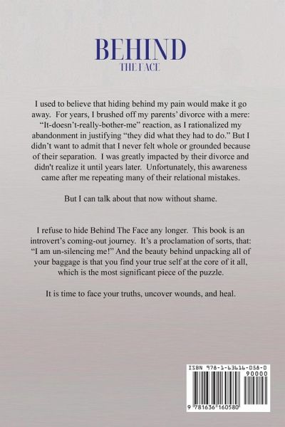I used to believe that hiding behind my pain would make it go away. For years, I brushed off my parents' divorce with a mere: "It-doesn't-really-bother-me" reaction, as I rationalized my abandonment in justifying "they did what they had to do." But I didn't want to admit that I never felt whole or grounded because of their separation. I was greatly impacted by their divorce and didn't realize it until years later. Unfortunately, this awareness came after me repeating many of their relational mistakes. But I can talk about that now without shame. I refuse to hide Behind The Face any longer. This book is an introvert's coming-out journey. It's a proclamation of sorts, that: "I am un-silencing me!" And the beauty behind unpacking all of your baggage is that you find your true self at the core of it all, which is the most significant piece of the puzzle. It is time to face your truths, uncover wounds, and heal.