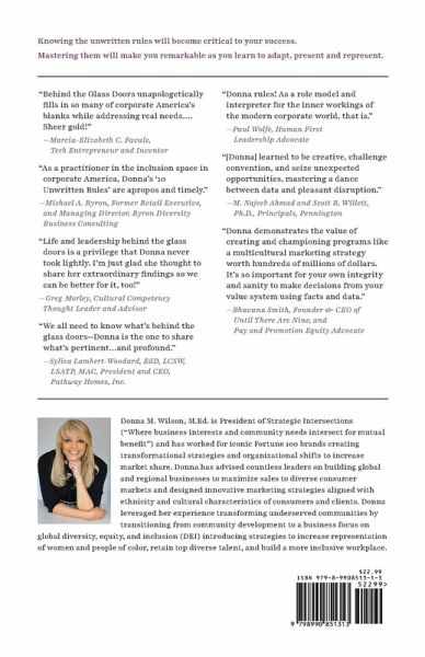 Knowing the unwritten rules will become critical to your success. Mastering them will make you remarkable as you learn to adapt, present and represent. Excited to be inside? Just what are you IN for? Whether it's your first day, first promotion or first all-hands call from the C-suite, unknowns behind the glass doors can make or break you, thrill you yet threaten your position, and secure or disrupt your life if you don't come prepared to meet new challenges. "Behind the Glass Doors unapologetically fills in so many of corporate America's blanks while addressing real needs.... Sheer gold!" --Marcia-Elizabeth C. Favale, Tech Entrepreneur and Inventor "As a practitioner in the inclusion space in corporate America, Donna's '10 Unwritten Rules' are apropos and timely." --Michael A. Byron, Former Retail Executive, and Managing Director, Byron Diversity Business Consulting "Life and leadership behind the glass doors is a privilege that Donna never took lightly. I'm just glad she thought to share her extraordinary findings so we can be better for it, too!" --Greg Morley, Cultural Competency Thought Leader and Advisor "We all need to know what's behind the glass doors-Donna is the one to share what's pertinent...and profound." --Sylisa Lambert-Woodard, EdD, LCSW, LSATP, MAC, President and CEO, Pathway Homes, Inc. "Donna rules! As a role model and interpreter for the inner workings of the modern corporate world, that is." --Paul Wolfe, Human First Leadership Advocate "[Donna] learned to be creative, challenge convention, and seize unexpected opportunities, mastering a dance between data and pleasant disruption." --M. Najeeb Ahmad and Scott R. Willett, Ph.D., Principals, Pennington "Donna demonstrates the value of creating and championing programs like a multicultural marketing strategy worth hundreds of millions of dollars. It's so important for your own integrity and sanity to make decisions from your value system using facts and data." --Bhavana Smith, Founder & CEO of Until There Are Nine, and Pay and Promotion Equity Advocate