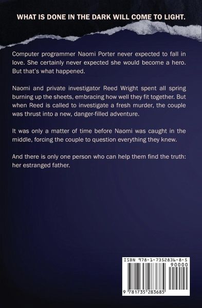 What is done in the dark will come to light. Computer programmer Naomi Porter never expected to fall in love. She certainly never expected she would become a hero. But that's what happened. Naomi and private investigator Reed Wright spent all spring burning up the sheets, embracing how well they fit together. But when Reed is called to investigate a fresh murder, the couple was thrust into a new, danger-filled adventure. It was only a matter of time before Naomi was caught in the middle, forcing the couple to question everything they knew. And there is only one person who can help them find the truth: her estranged father.