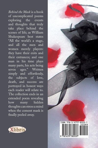 Behind the Mask is a book of uncomplicated poems exploring the events and thoughts that truly take place behind the scenes of life; as William Shakespeare best states "All the world's a stage, and all the men and women merely players: they have their exits and their entrances; and one man in his time plays many parts, his acts being seven ages." Written simply and effortlessly, the subjects of love, death, and success are portrayed in honest ways each reader will relate to. The collection ends in an extended poem revealing how many hidden thoughts can stress a mind when the cement mask is finally peeled away.