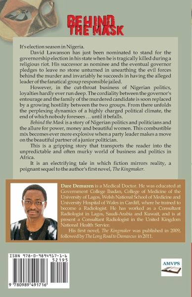 It's election season in Nigeria. David Lawanson has just been nominated to stand for the governorship election in his state when he is tragically killed during a religious riot. His successor as nominee and the eventual governor pledges to leave no stone unturned in unearthing the evil forces behind the murder and invariably he succeeds in having the alleged leader of the fanatical group responsible jailed. However, in the cut-throat business of Nigerian politics, loyalties hardly ever run deep. The cordiality between the governor's entourage and the family of the murdered candidate is soon replaced by a growing hostility between the two groups. From there unfolds the perplexing dynamics of a highly charged political climate, the end of which nobody foresees ... until it befalls. Behind the Mask is a story of Nigerian politics and politicians and the allure for power, money and beautiful women. This combustible mix becomes ever more explosive when a party leader makes a move on the beautiful partner of a junior politician. This is a gripping story that transports the reader into the unpredictable and often murky world of business and politics in Africa. It is an electrifying tale in which fiction mirrors reality, a poignant sequel to the author's first novel, The Kingmaker Dare Demuren is a Medical Doctor. He was educated at Government College Ibadan, College of Medicine of the University of Lagos, Welsh National School of Medicine and University Hospital of Wales in Cardiff, where he trained to become a Radiologist. He has worked as a Consultant Radiologist in Lagos, Saudi-Arabia and Kuwait, and is at present a Consultant Radiologist in the United Kingdom National Health Service. His first novel, The Kingmaker was published in 2009, followed by The Long Road to Damascus in 2011.