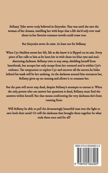 Bellamy Tyler never truly believed in fairytales. That was until she met the woman of her dreams, instilling her with hope that a life she'd only ever read about in her favorite romance novels could come true. But fairytales never do exist. At least not for Bellamy. When Cyr Maddox enters her life, life as she knew it is flipped on its axis. Every piece of her calls to him as he lures her in with those haunted crystal blue eyes and soul-shattering darkness. Bellamy tries to stay away, shielding herself from heartbreak, but accepts her only escape from her tortured soul is within Cyr's embrace. The temptation to explore Cyr and uncover all the secrets he hides behind his mask will be her undoing. As the darkness around him entrances her, Bellamy gives up on running and allows it to consume her. But the past will never stay dead, despite Bellamy's attempts to outrun it. When the only person who can answer her questions is dead, Bellamy must find the answers within herself. But that means confronting the very darkness she's been running from. Will Bellamy be able to pull the devastatingly beautiful man into the light to save both their souls? Or will the darkness that brought them together be what ends them once and for all?