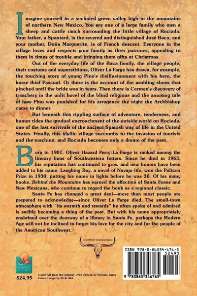 Imagine yourself in a secluded green valley high in the mountains of northern New Mexico. You are one of a large family who own a sheep and cattle ranch surrounding the little village of Rociada. Your father, a Spaniard, is the revered and distinguished José Baca, and your mother, Doña Marguerite, is of French descent. Everyone in the village loves and respects your family as their patrones, appealing to them in times of trouble and bringing them gifts at Christmas. Out of the everyday life of the Baca family, the village people, their customs and superstitions, Oliver La Farge has drawn, for…mehr