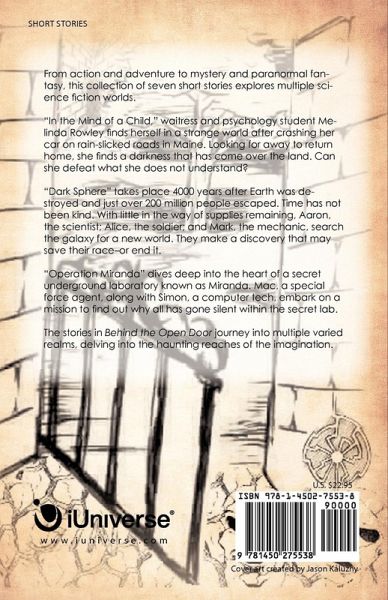 From action and adventure to mystery and paranormal fantasy, this collection of seven short stories explores multiple science fiction worlds. "In the Mind of a Child," waitress and psychology student Melinda Rawley finds herself in a strange world after crashing her car on rain-slicked roads in Maine. Looking for away to return home, she finds a darkness that has come over the land. Can she defeat what she does not understand? The story "Dark Sphere" takes place 4,000 years after Earth was destroyed and just over 200 million people escaped. Time has not been kind. With little in the way of supplies remaining, Aaron, the scientist; Alice, the soldier; and Mark, the mechanic, search the galaxy for a new world. They make a discovery that may save their race-or end it. "Operation Miranda" dives deep into the heart of a secret underground laboratory known as Miranda. Mac, a Special Forces agent, and Simon, a computer tech, embark on mission to find out why all has gone silent within the secret lab. The stories in Behind the Open Door journey into many and varied realms, delving into the haunting reaches of the imagination.