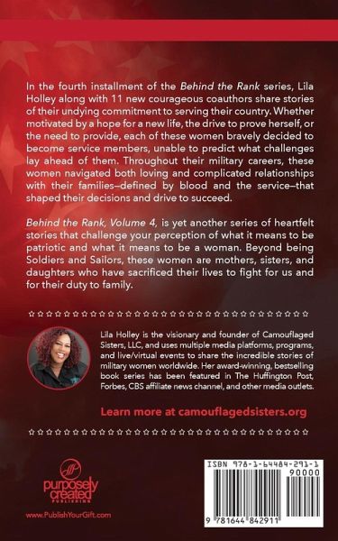 In the fourth installment of the Behind the Rank series, Lila Holley along with 11 new courageous coauthors share stories of their undying commitment to serving their country. Whether motivated by a hope for a new life, the drive to prove herself, or the need to provide, each of these women bravely decided to become service members, unable to predict what challenges lay ahead of them. Throughout their military careers, these women navigated both loving and complicated relationships with their families-defined by blood and the service-that shaped their decisions and drive to succeed. Behind the Rank, Volume 4, is yet another series of heartfelt stories that challenge your perception of what it means to be patriotic and what it means to be a woman. Beyond being Soldiers and Sailors, these women are mothers, sisters, and daughters who have sacrificed their lives to fight for us and for their duty to family.