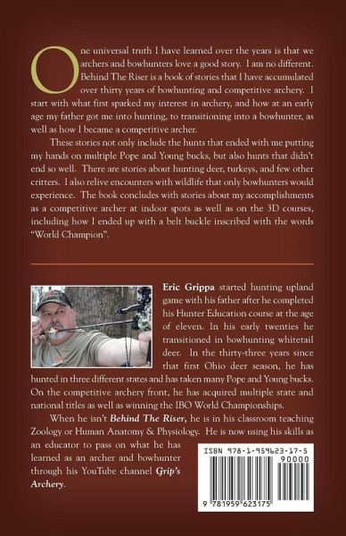 One universal truth I have learned over the years is that we archers and bowhunters love a good story. I am no different. Behind The Riser is a book of stories that I have accumulated over thirty years of bowhunting and competitive archery. I start with what first sparked my interest in archery, and how at an early age my father got me into hunting, to transitioning into a bowhunter, as well as how I became a competitive archer. These stories not only include the hunts that ended with me putting my hands on multiple Pope and Young bucks, but also hunts that didn't end so well. There are stories about hunting deer, turkeys, and few other critters. I also relive encounters with wildlife that only bowhunters would experience. The book concludes with stories about my accomplishments as a competitive archer at indoor spots as well as on the 3D courses, including how I ended up with a belt buckle inscribed with the words "World Champion".