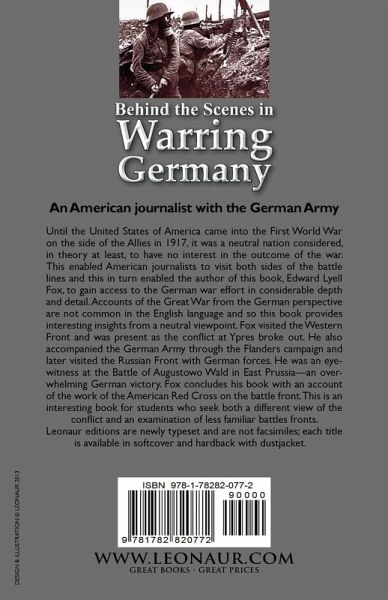 An American journalist with the German Army Until the United States of America came into the First World War on the side of the Allies in 1917, it was a neutral nation considered, in theory at least, to have no interest in the outcome of the war. This enabled American journalists to visit both sides of the battle lines and this in turn enabled the author of this book, Edward Lyell Fox, to gain access to the German war effort in considerable depth and detail. Accounts of the Great War from the German perspective are not common in the English language and so this book provides interesting insights from a neutral viewpoint. Fox visited the Western Front and was present as the conflict at Ypres broke out. He also accompanied the German Army through the Flanders campaign and later visited the Russian Front with German forces. He was an eyewitness at the Battle of Augustowo Wald in East Prussia-an overwhelming German victory. Fox concludes his book with an account of the work of the American Red Cross on the battle front. This is an interesting book for students who seek both a different view of the conflict and an examination of less familiar battles fronts. Leonaur editions are newly typeset and are not facsimiles; each title is available in softcover and hardback with dustjacket.