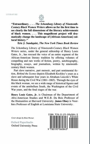 Part slave narrative, part memoir, and part sentimental fiction Behind the Scenes depicts Elizabeth Keckley's years as a salve and subsequent four years in Abraham Lincoln's White House during the Civil War. Through the eyes of this black woman, we see a wide range of historical figures and events of the antebellum South, the Washington of the Civil War years, and the final stages of the war.