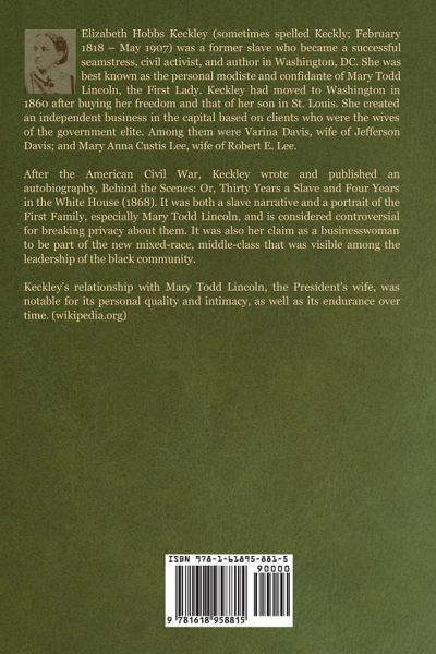 Elizabeth Hobbs Keckley (sometimes spelled Keckly; February 1818 – May 1907) was a former slave who became a successful seamstress, civil activist, and author in Washington, DC. She was best known as the personal modiste and confidante of Mary Todd Lincoln, the First Lady. Keckley had moved to Washington in 1860 after buying her freedom and that of her son in St. Louis. She created an independent business in the capital based on clients who were the wives of the government elite. Among them were Varina Davis, wife of Jefferson Davis; and Mary Anna Custis Lee, wife of Robert E. Lee. After the American Civil War, Keckley wrote and published an autobiography, Behind the Scenes: Or, Thirty Years a Slave and Four Years in the White House (1868). It was both a slave narrative and a portrait of the First Family, especially Mary Todd Lincoln, and is considered controversial for breaking privacy about them. It was also her claim as a businesswoman to be part of the new mixed-race, middle-class that was visible among the leadership of the black community. Keckley's relationship with Mary Todd Lincoln, the President's wife, was notable for its personal quality and intimacy, as well as its endurance over time. (wikipedia.org)