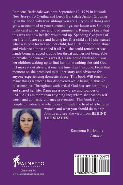 Rameena Barksdale was born September 12, 1979, in Newark, New Jersey, to Cynthia and Leroy Barksdale Jr. Growing up in the hood with four siblings, she saw all types of things and grew accustomed to her surroundings. Their house was one of Saturday night card games, beer, and loud arguments. Rameena knew that this was not how her life would end up. After spending five years of her life in foster care and having her first child at nineteen, she wanted what was best for her and her child, but a life of domestic abuse and violence almost ended it all. All she could remember were hands being wrapped around her throat and not being able to breathe. She knew that was it: all she could think about was her children waking up to find her not breathing. She said, "God if I make it out alive just one last time, then I'm done." From that moment on, she promised to tell her story and advocate for anyone experiencing domestic abuse. Working in the cosmetology field as Imeanhair_nj._stylist has allowed her to reach many young woman and tell her story. This book will touch on many things Rameena has discovered while being in abusive relationships. Throughout each ordeal, God has seen her through and spared her life. Rameena is now CEO and founder of I.M.T.A. ("I Am More Than Anything"), Inc., where she teaches self-worth and domestic violence prevention at numerous shelters and transitional homes in her area . This book is for people to understand what goes on inside the head of a battered woman and what you should do to help. Join us and see the view from Behind the Shades.mrthnanything@gmail.com imeanhair@gmail.com Facebook; Iam more than anything inc IG; Imeanhair_nj._stylist