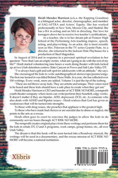 Heidi Mendez Harrison (a.k.a. "Rapping Grandma") is a bilingual actor, director, choreographer, and member of SAG-AFTRA and Actors' Equity. She has worked professionally in New York, Mexico City, and Madrid. She has a BA in acting and an MA in directing. Her love for teenagers drove her to receive two teacher's certifications. As a teacher, she is in her dream job at Pioneer High School of the Performing Arts, teaching improv, speech, acting, and playwriting. As an actor, she has most recently been seen as Mrs. Peterson in the TV series Granite Flats. As a director, she returned to the Jackson Hole Playhouse for a production of Steel Magnolias. In August of 2014 and in response to a personal spiritual revelation to her question "Now that I am an empty nester, what am I going to do with the rest of my life?" Heidi started volunteering nine hours a week, doing theater with kids locked up at two Utah detention centers: Slate Canyon in Provo and Salt Lake Valley DT. "I've always had a gift and soft spot for adolescents with an attitude," she says. She encouraged the kids to write autobiographical stories, raps, poems, songs. The first one turned in was titled Behind These Walls. In a year, she has collected over 150 writings. Every week, more are added. Volume 1 is just the tip of the iceberg. "These are not throwaway kids. They are artistic and unique. Their voices need to be heard, and these kids should have a safe place to create when they get out." Heidi Mendez Harrison is CEO and founder of Act Risk No More, a nonprofit youth theater company where teens can write/perform their heartfelt, edgy works. It doesn't matter if they are bipolar, ADD, depressed, OCD, etc. As someone who also deals with ADHD and bipolar issues, Hedi realizes that God has given us weaknesses that will be turned into strengths. To those with drug issues, she preaches that applause is the greatest high. To those who have made bad choices or are suicidal due to abuse or neglect, she points to the arts as a rescue. Heidi often goes to court to convince the judges to allow the kids to do community service hours through Act Risk No More. The nonprofit creates original plays from these writings and performs them for the kids in rehab, DT, O and A programs, work camps, group homes, etc., all over Utah Valley. The dream is that this book will be soon turned into a Broadway musical, all the over 150 writings will be used in a documentary, and the rescue mission of Act Risk No More will become a national institution.