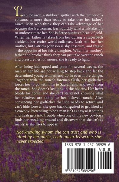Leah Johnson, a stubborn spitfire with the temper of a volcano, is more than ready to take over her father's ranch. Men who think they can take advantage of her because she is a woman, learn quickly what a mistake it is to underestimate her. She is fierce but has a heart of gold. When her father is taken from her during a stagecoach accident, her entire world collapses. Leah still has her mother, but Patricia Johnson is shy, insecure, and fragile - the opposite of her feisty daughter. When her mother's father and brother think they can just take over the ranch and pressure her for money, she is ready to fight. After being kidnapped and gone for several weeks, the men in her life are not willing to step back and let the determined young woman end up in even more danger. Together with the ranch's foreman Cash, her godfather forces her to go with him to Sacramento and away from the ranch. She doesn't last long in the big city. Her heart bleeds for home, and she can't stand not knowing what her relatives are doing to her beloved ranch. After convincing her godfather that she needs to return and can't hide forever, she goes back disguised to get hired as a cowboy. Pretending to be a man isn't as easy as it sounds and Leah gets into trouble when one of the new cowboys finds her sneaking around and discovers that she isn't as manly as she tries to appear. Not knowing whom she can trust and who is hired by her uncle, Leah unearths secrets she never expected.