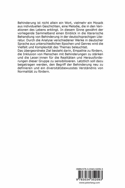 Behinderung ist nicht allein ein Wort, vielmehr ein Mosaik aus individuellen Geschichten, eine Melodie, die in den Variationen des Lebens erklingt. In diesem Sinne gewährt der vorliegende Sammelband einen Einblick in die literarische Behandlung von Behinderung in der deutschsprachigen Literatur. Durch die Analyse verschiedener Werke in deutscher Sprache aus unterschiedlichen Epochen und Genres wird die Vielfalt und Komplexität des Themas beleuchtet.