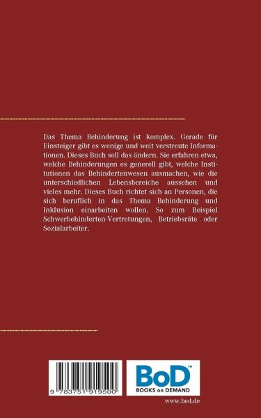 Das Thema Behinderung ist komplex. Gerade für Einsteiger gibt es wenige und weit verstreute Informationen. Dieses Buch soll das ändern. Sie erfahren etwa, welche Behinderungen es generell gibt, welche Institutionen das Behindertenwesen ausmachen, wie die unterschiedlichen Lebensbereiche aussehen und vieles mehr.Dieses Buch richtet sich an Personen, die sich beruflich in das Thema Behinderung und Inklusion einarbeiten wollen. Angesprochen sind zum Beispiel Schwerbehinderten-Vertretungen, Betriebsräte, Sozialarbeiter und andere Personen, die im Bereich Behinderung arbeiten.