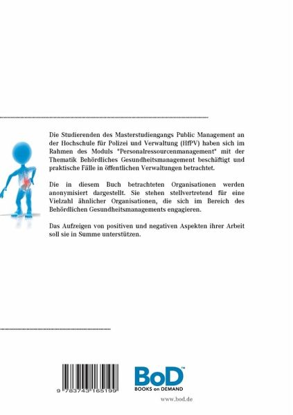 Die Studierenden des Masterstudiengangs Public Management an der Hochschule für Polizei und Verwaltung (HfPV) haben sich im Rahmen des Moduls "Personalressourcenmanagement" mit der Thematik Behördliches Gesundheitsmanagement beschäftigt und praktische Fälle in öffentlichen Verwaltungen betrachtet.Die in diesem Buch betrachteten Organisationen werden anonymisiert dargestellt. Sie stehen stellvertretend für eine Vielzahl ähnlicher Organisationen, die sich im Bereich des Behördlichen Gesundheitsmanagements engagieren.Das Aufzeigen von positiven und negativen Aspekten ihrer Arbeit soll sie in Summe unterstützen.