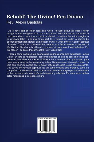 As is have said on other occasions, when I thought about this book I never thought of it as a religious book, nor one of those books that remain untouched in our bookshelves. I saw it as a book to scribble in, to write notes in the margins to be reviewed later. To be able to go back to it, without any order. A book to be opened almost hap-hazardly, and reflect on what is written there. A sort of spiritual "Rayuela" This is how I conceived this material, as a fellow traveler on the road of life, like that friend who is with us in moments of deep search and reflection. For this reason I dedicate these thoughts to my urban flock. Tal cual como lo dije en otra oportunidad, cuando pensé esta publi-cación, nunca vi en él un libro de religiosidad, así como tampoco en uno de esos libros que permanecen intocables en nuestra bibliote-ca. Lo vi como un libro para rayar, para hacer anotaciones en los márgenes y volver. Siempre volver sin ningún orden. Un libro para abrir de manera casi fortuita y reflexionar sobre lo que allí está es-crito. Una suerte de Rayuela espiritual. Es así como concibo este material, como un compañero de viaje en el camino de la vida; co-mo ese amigo que nos acompaña en los momentos de más profun-da búsqueda y reflexión. Por esta razón dedico estas reflexiones a mi rebaño urbano.
