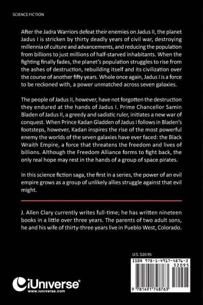 After the Jadra Warriors defeat their enemies on Jadus II, the planet Jadus I is stricken by thirty deadly years of civil war, destroying millennia of culture and advancements, and reducing the population from billions to just millions of half-starved inhabitants. When the fighting finally fades, the planet's population struggles to rise from the ashes of destruction, rebuilding itself and its civilization over the course of another fifty years. Whole once again, Jadus I is a force to be reckoned with, a power unmatched across seven galaxies. The people of Jadus II, however, have not forgotten the destruction they endured at the hands of Jadus I. Prime Chancellor Samin Bladen of Jadus II, a greedy and sadistic ruler, initiates a new war of conquest. When Prince Kadan Gladden of Jadus I follows in Bladen's footsteps, however, Kadan inspires the rise of the most powerful enemy the worlds of the seven galaxies have ever faced: the Black Wraith Empire, a force that threatens the freedom and lives of billions. Although the Freedom Alliance forms to fight back, the only real hope may rest in the hands of a group of space pirates. In this science fiction saga, the first in a series, the power of an evil empire grows as a group of unlikely allies struggle against that evil might.